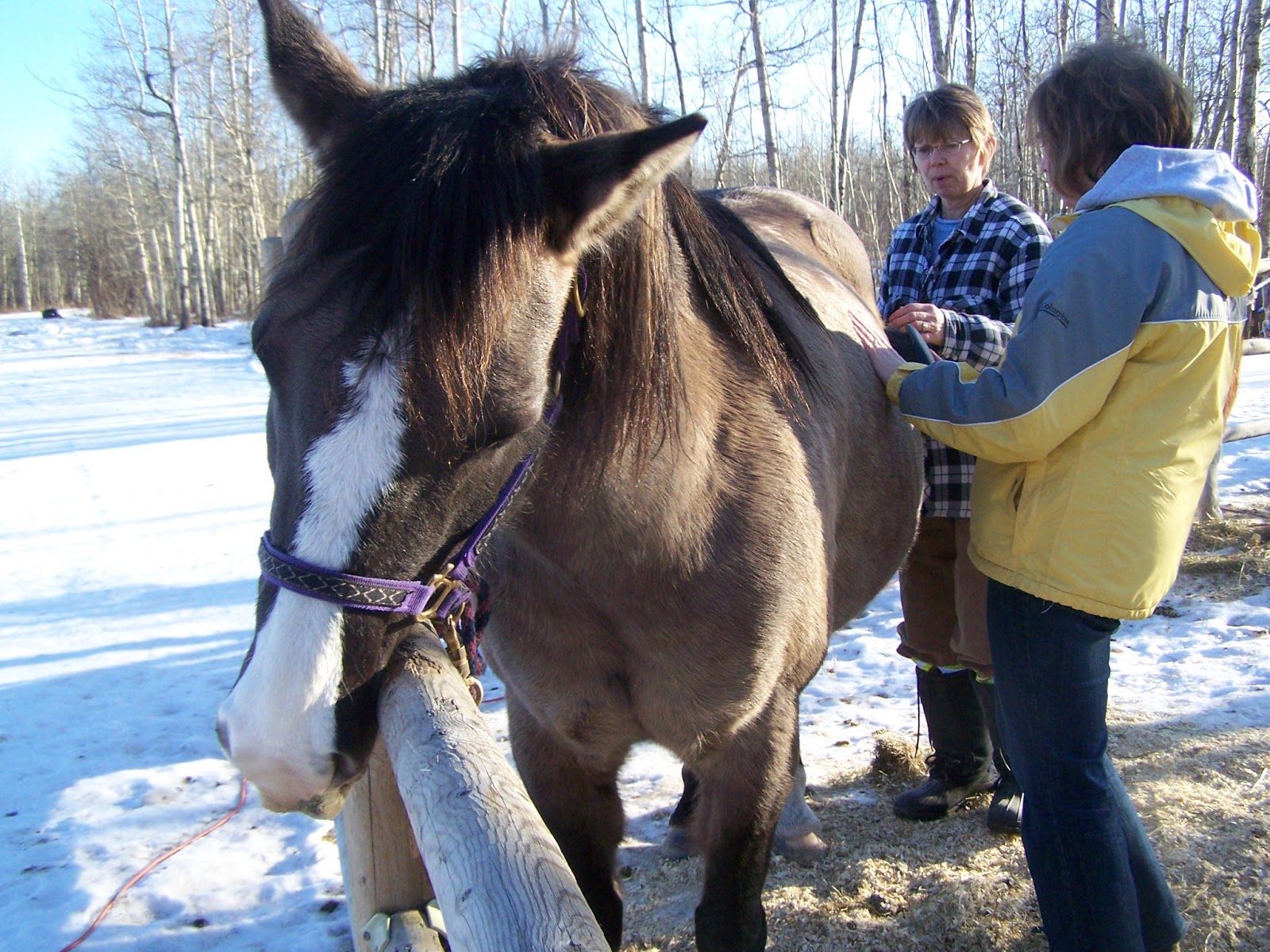 Diane is close by giving me instructions on getting the horse used to me being near.